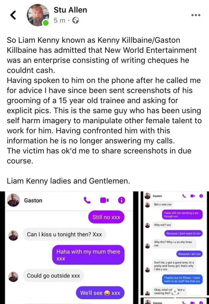 And the final screenshots revealed came from Facebook where a person named Stu Allen revealed that Kenny had been grooming a young girl into a sexual relationship.