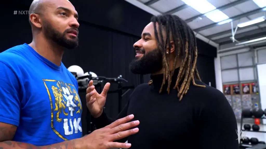 The former Sha Samuels now Ed Harvey makes his NXT UK debut facing off against the leader of Gallus, Joe Coffey. Harvey starts well early on matching Coffey in strength but its not long before Coffey takes control sending Harvey to the outside, Harvey grabs a mic, says he’s not having none of this and announces himself as Sha Samuels.
