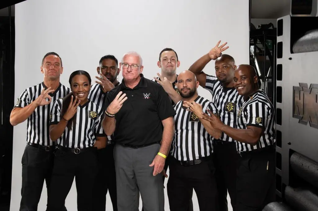 Today on Instagram, Wuertz posted a photo with him and his fellow NXT referees in addition to WWE referee Scott Armstrong. While the entire group is holding up three fingers to signify the referee’s job, Wuertz holds his hand in a different manner, using the “okay” gesture instead of holding up three fingers like the remainder of his counterpart.