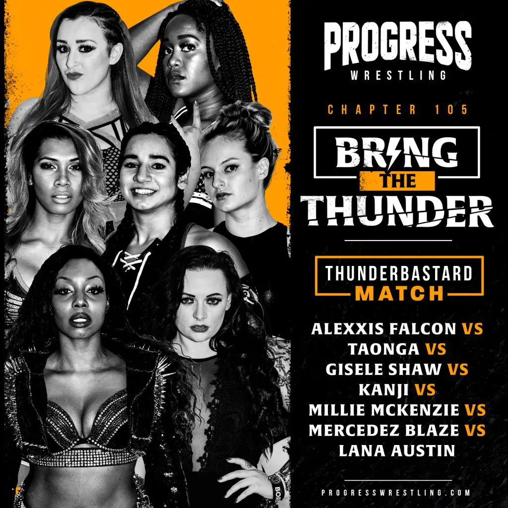 Lana Austin started the match off with Millie McKenzie, the two battle it out before Alexxis Falcon enters the match, she is followed by Taonga 2 minutes later, as the four women do battle inside and outside the ring. Lana Austin picks up the first elimination after hitting a drapping DDT on Alexxis Falcon to get the pin fall. Millie McKenzie then eliminates Taonga, hitting a spear and the getting pin fall just as Kanji makes her way into the match. Millie, Lana and Kanji battle it out in the ring and Millie is able catch Lana and hit a devastating German suplex to eliminate her by pin fall, leaving just Millie and Kanji to battle out. Mercedez Blaze then enters the match but decides to wait on the outside whilst Kanji and Millie fight each other inside the ring, Kanji is able to get a roll up on Millie after recovering quickly from a German suplex catching a now tired Millie and eliminating her. Mercedez now had to get involved but just as she is about to get into the ring, Gisele Shaw enters the match, Mercedez tries to convince Shaw to team up with her and eliminate Kanji, Shaw agrees but immediately turned on Mercedez throwing her into the wall. Shaw picks up a iron bar out from the under the ring and attacks Kanji with the iron bar, focussing on her arm and is then disqualified stating this match was a farce and she was already the No. 1 contender from before the lockdown. Mercedez now stalks Kanji as if lion eyeing up her wounded prey but she is unable to put Kanji away as she keeps fighting back despite the arm injury. Kanji would hit Mercedez with turnbuckle assisted stunner and then roll her up to get the pin fall, Kanji wins the first ever women’s Thunderbastard match, earning a shot at the current Progress Women’s Champion Jinny.