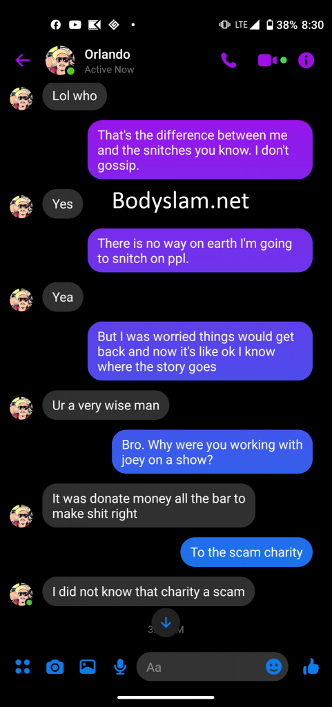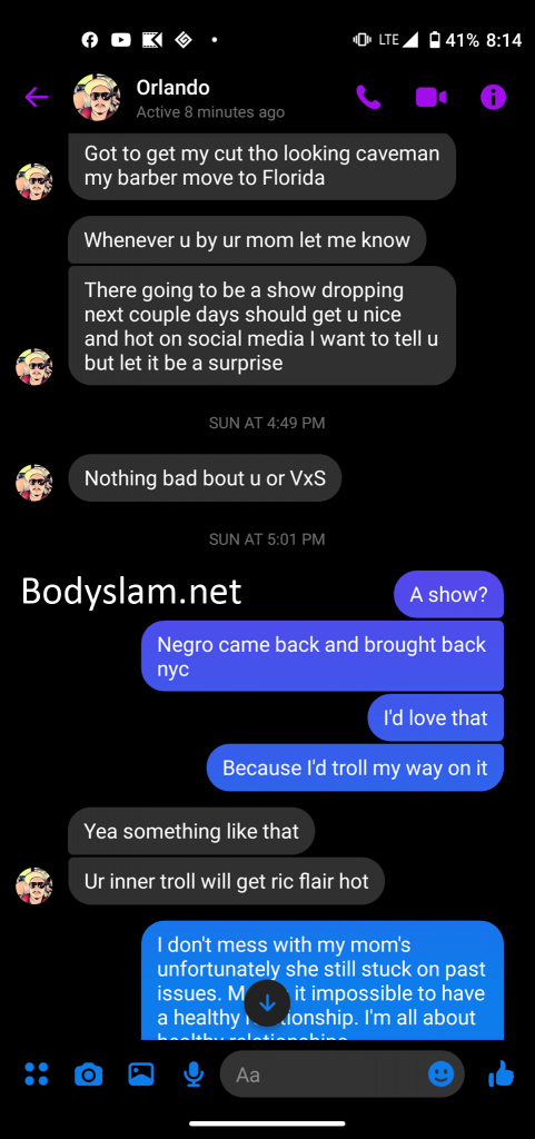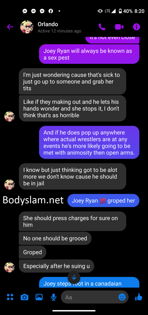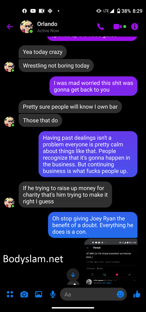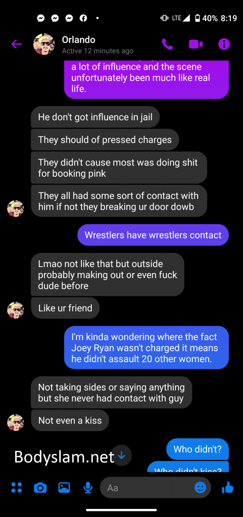 Another screenshot claims Fernandez only booked four people for the event and claims he told everyone he booked about Ryan’s involvement, and while Sanchez warns him association with Ryan would probably lead to problems for him in the independent wrestling community, Fernandez claims he was only thinking about “making it right.”