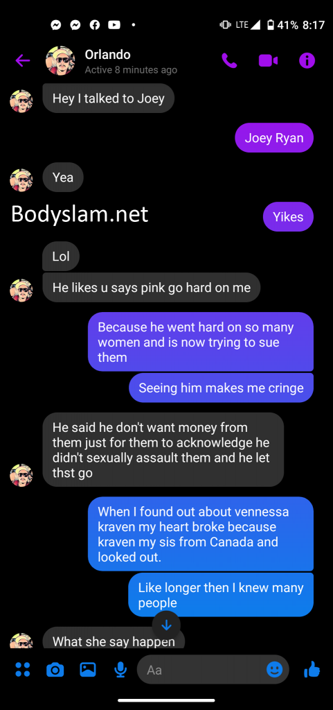 Throughout the course of the day, independent wrestler Pinkie Sanchez has been calling out Violence x Suffering, a wrestling promotion based in Brooklyn, NY for hiding ties to Joey Ryan. Sanchez has already revealed screenshots on his Twitter account showing that co-promoter of the company Orlando Fernandez remains in contact with Joey Ryan and had knowledge prior to Monday that Ryan would be involved on an independent show in Tennessee that has since been canceled following the revelations of Ryan’s involvement and the fact many pointed out the charity involved in the event is sketchy due to its ties to controversial Christian evangelist and author Joyce Meyer.