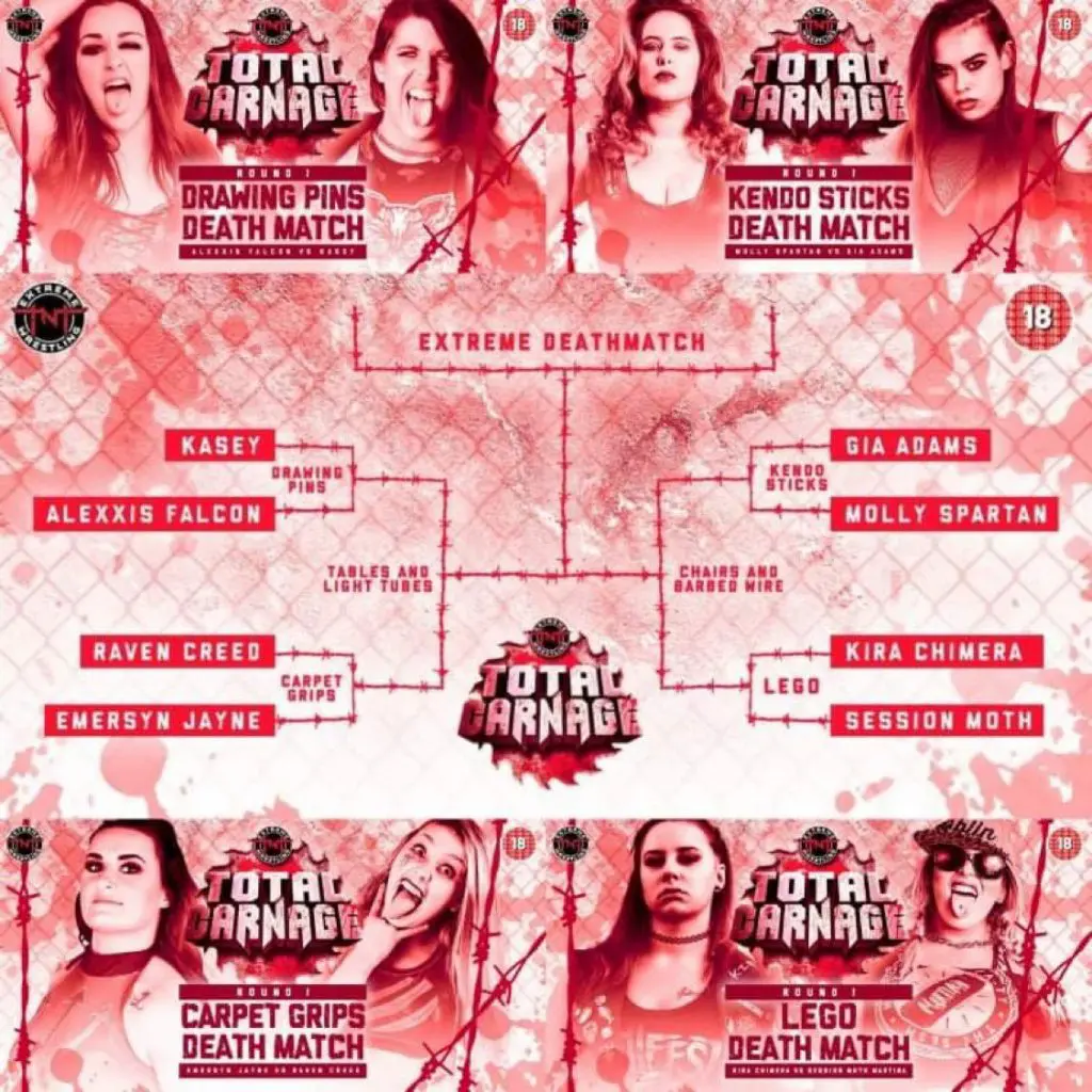 Tomorrow night, TNT Extreme Wrestling based in Liverpool England make history with the first ever all female deathmatch tournament. Bringing together some of the biggest names in British Wrestling from across the country, with the names being announced last week, including Alexxis Falcon, Session Moth Martina, Kasey and Molly Sparton among others.