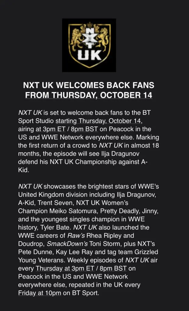 Fans and regular watchers of NXT UK will once again be able to see shows with fans in attendance once again as of next week’s episode on the 14th of October, the show will also feature the NXT UK Championship match between Champion Ilja Dragunov and No. 1 contender A-Kid.