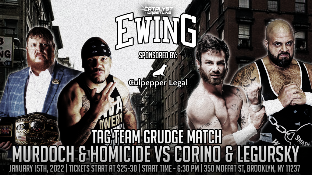 Now taking that role as opponent will be Corino, son of a former NWA Champion himself and Wrecking Ball Legursky as they face Murdoch and Homicide in the headlining match sponsored by Culpepper Legal.