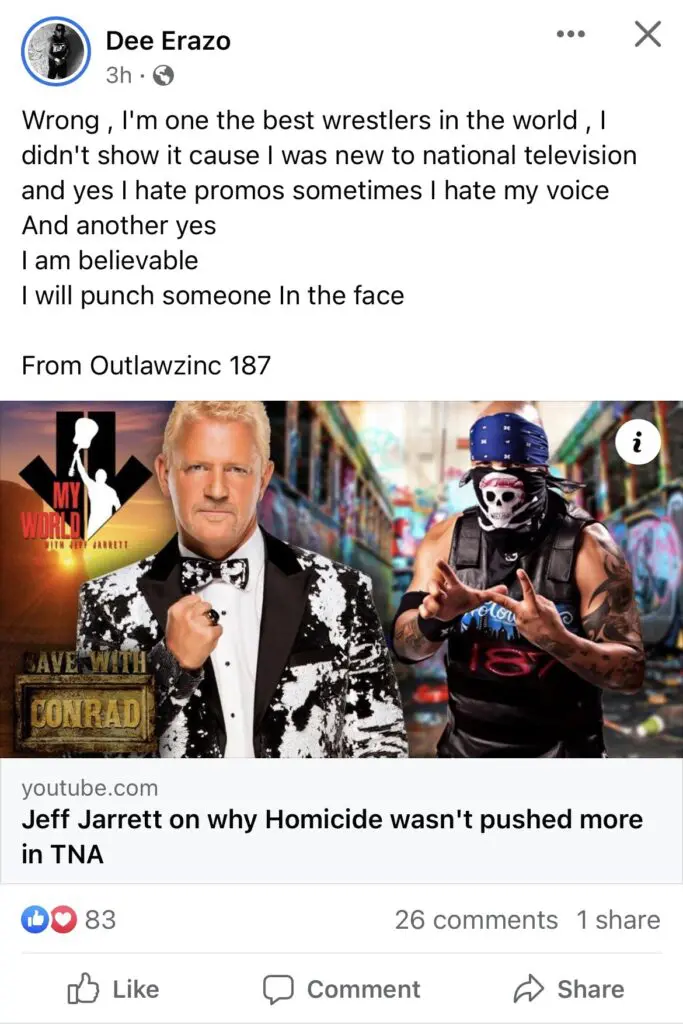 Over a yeah ago, Jeff Jarrett spoke about Homicide on his “My World” podcast about Homicide. On the show, Jarrett was asked why Homicide wasn’t pushed more in TNA. Jarrett said that Homicide could work, but he wasn’t the best worker and his words word authentic, but he wasn’t the best promo in the world. Jeff went on to say that Homicide just couldn’t get completely “over the hump” despite being around for a long time. Well, now, a year later, Homicide has caught wind of this and took to his Facebook to say “Wrong, I’m one the best wrestlers in the world, I didn’t show it cause I was new to national television and yes I hate promos sometimes I hate my voice And another yes I am believable I will punch someone In the face.”