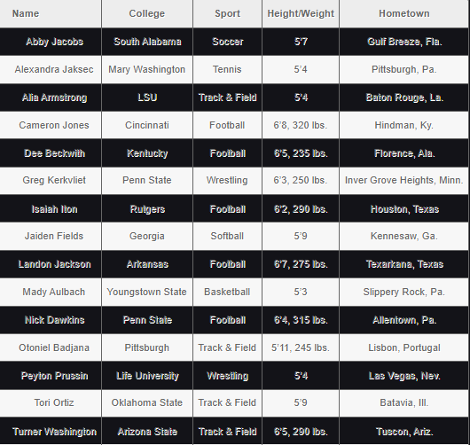 The class is highlighted by two-time NCAA All American wrestler Greg Kerkvliet from Penn State University, four-time NCAA National Champion thrower Turner Washington from Arizona State University and NCAA Champion hurdler Alia Armstrong from Louisiana State University.