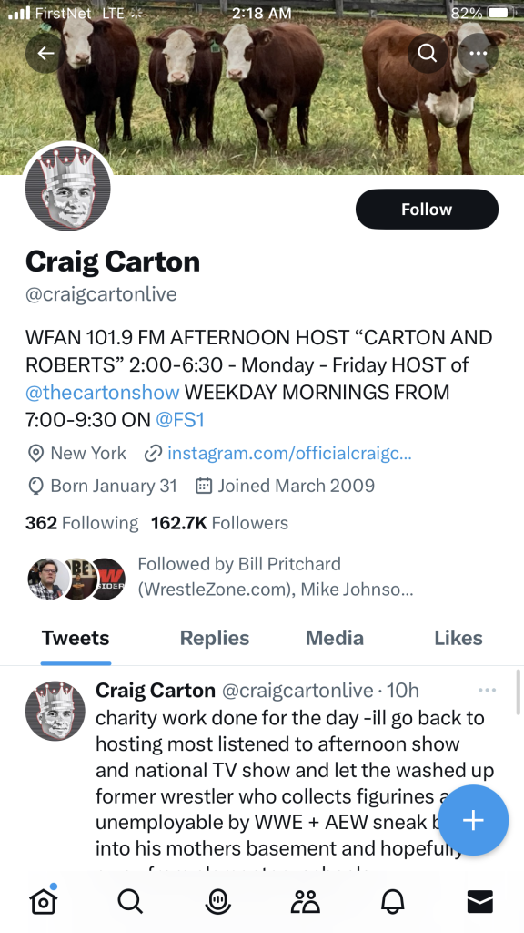Matt Cardona shared a screen shot of a message where somebody asked him to answer his phone from their 212 area code number, and tagged the radio & tv host Craig Carton when he posted it. He responded and said the only way he’d come In is if they flew him there.