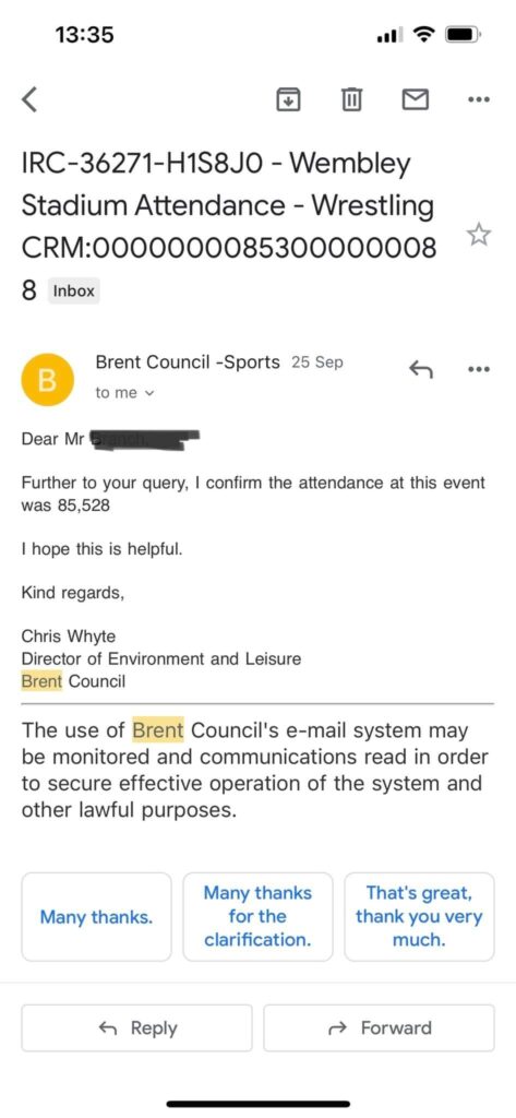 Now, we have a new number courtesy of Brent City Council, which covers Wembley Stadium. Following an FOI the council would send a reply on the attendance on their record for the event, with the number exceeding both previous reported numbers, noting that the attendance was over 85,000.
