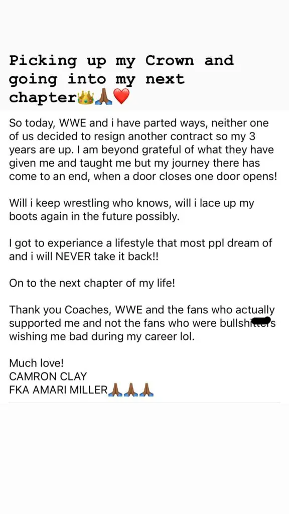 NXT star, Amari Miller (real name Camron Branae) took to Instagram to announce that she and WWE have agreed to mutually part ways.