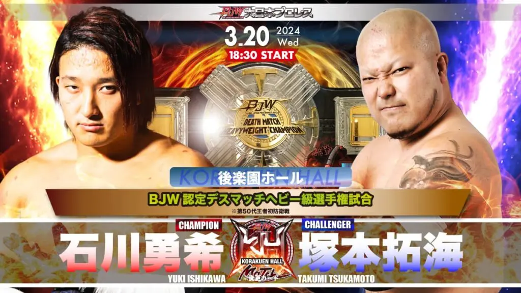 In another title match scheduled for March 20th, the BJW Certified Deathmatch Heavyweight Champion Yuki Ishikawa will put his title on the line against Takumi Tsukamoto.