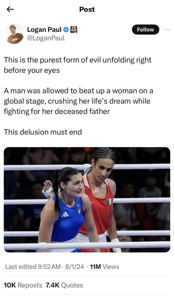 And this made people furious! The reason? Because Khelif, a biological woman, had higher levels of testosterone before a 2023 world championship fight, and was disqualified. Never mind the fact that the “unspecified gender eligibility test” happened in 2023 and had nothing to do with this fight. Never mind the fact that the organization who offered the test, the IBA, has been banned from the Olympics since 2019. Never mind the fact that women produce testosterone, just like men produce estrogen. Never mind that Logan Paul just doesn’t understand the female body. He had a point to make. Even if it was wrong.