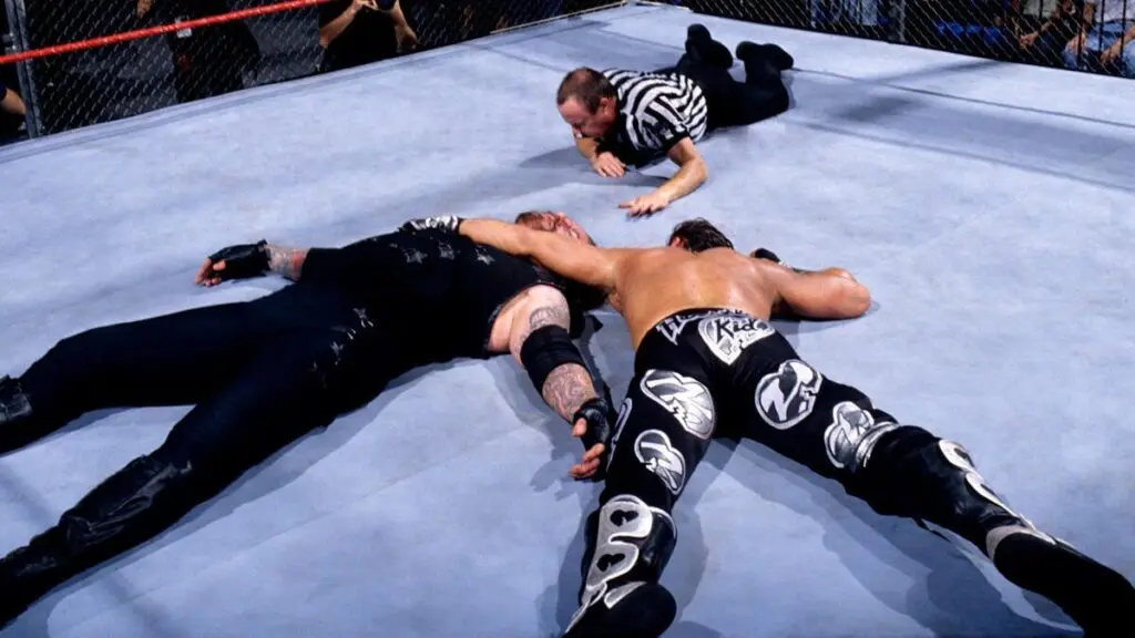 The two of them climb to the top of the Cell. Michaels, who is a mess at this point, bleeds on the camera directly below him. He tries to run away by climbing down the other side of the cage. Undertaker steps on his hand, leading to Michaels falling from about 12 feet up through the announce table. It’s a visually stunning moment, something that had never happened in the WWF before. It is also a moment that WWE would probably reference more today if Mankind didn’t try to die the next time they utilized this stipulation.