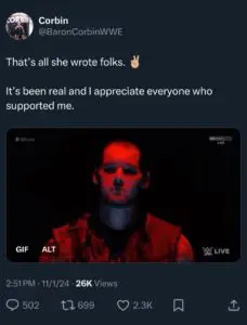 The former WWE United States and NXT Tag Team Champion posted on his X account on Friday, November 1 where he said in the caption ‘That’s all she wrote, folks, it’s been real and I appreciate everyone who supported me.’ seemingly referring to a potential departure from the WWE after Corbin recently came back from WWE NXT where he evolved and revamped himself in the last year.