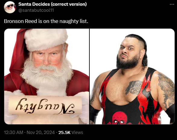 And since Santa Claus knows when you are sleeping, and he knows when you’re awake, and he knows if you’ve been bad or good, for f*ck sake, man. Be good. That’s a lesson that is too late to learn for Bronson Reed, as Santa has officially decided that Bronson Reed is on the naughty list.