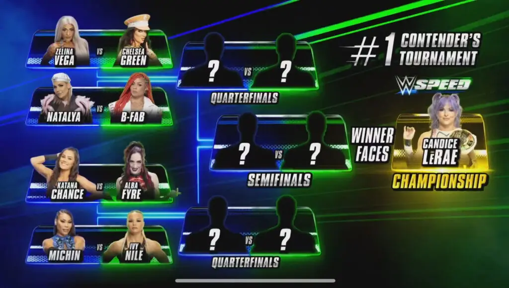 Following the men’s finals today, WWE announced the next Women’s Speed Tournament which starts next week with Zelina Vega vs. Chelsea Green in the first round. The other first round matches include Natalya vs B-Fab, Katana Chance vs. Alba Fyre, and Michin vs. Ivy Nile. The winner will get a shot at Candice LeRae’s Speed Title. You can see the full bracket below.