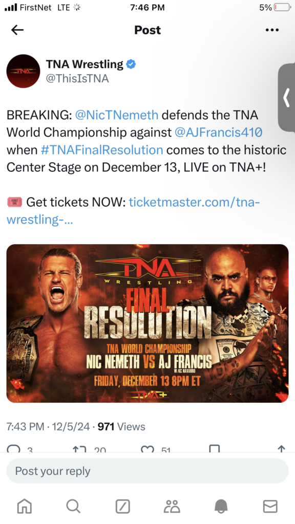 Can AJ Francis become the NEW TNA World Champion, or will Nemeth continue his reign with another successful defense? We’ll have to tune in next Friday night to Final Resolution.