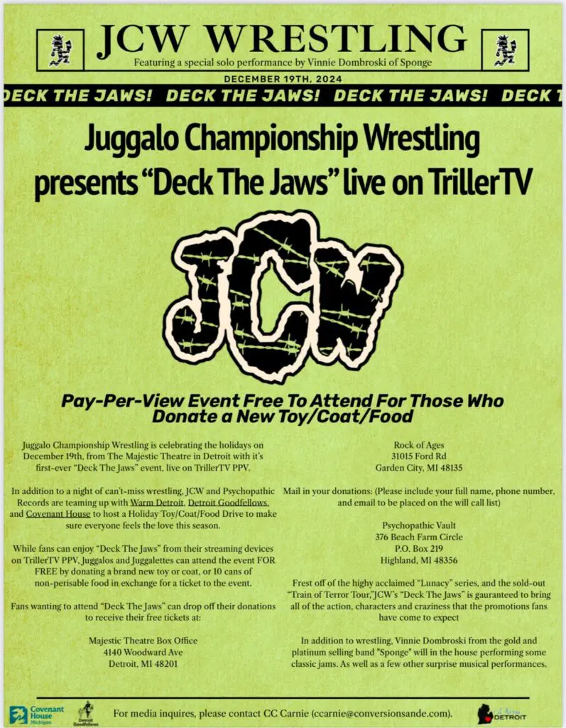 Juggalo Championship Wrestling presents ‘Deck The Jaws’ live on December 19, 2024 from the Majestic Theatre in Detroit, Michigan. Fans who want to attend this event can do so, for FREE. All you have to do is donate a new toy, coat and/or 10 cans of non-perishable food in exchange for a ticket. If you’d like to attend, you can drop donations off at the Majestic Theatre Box Office for a ticket.