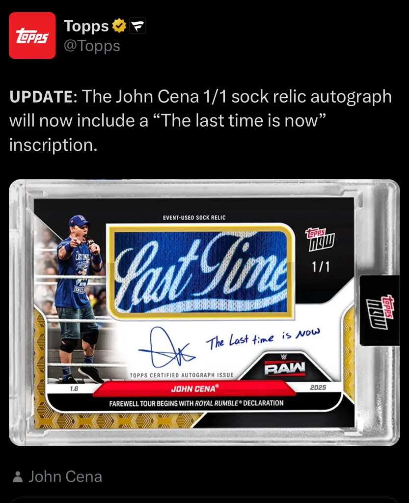 The John Cena 1/1 card originally had his autograph and a piece of his sock worn on RAW. Now, topps has revealed that John has made it a little extra special and on top of his signature, he’s also inscribed the card with “The Last Time Is Now.” For collectors, inscriptions are ways to make your card extra special and more rare, especially a 1/1. You may be the only person in the world to have a John Cena autograph with that inscription if you’re lucky enough to pull that card.