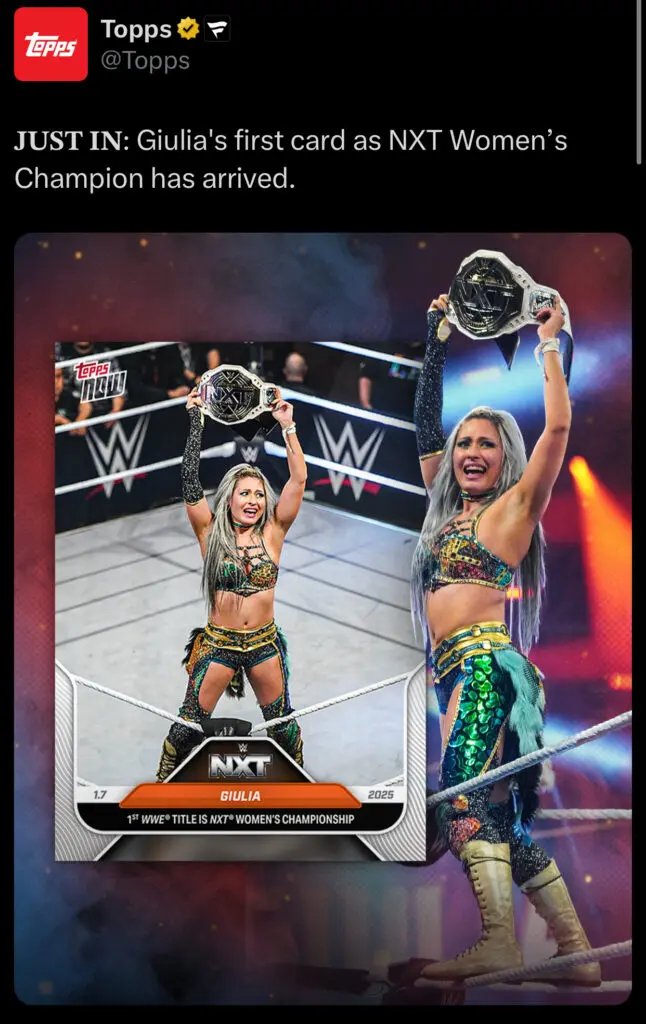 Now, Topps revealed today that Topps Now has released a special card for Giulia’s Chanpionship win. This is Guilia’s first official card with Topps and her first as NXT Champion. The card is on sale now and is only on sale until January 12 at 1PM ET, so act fast!