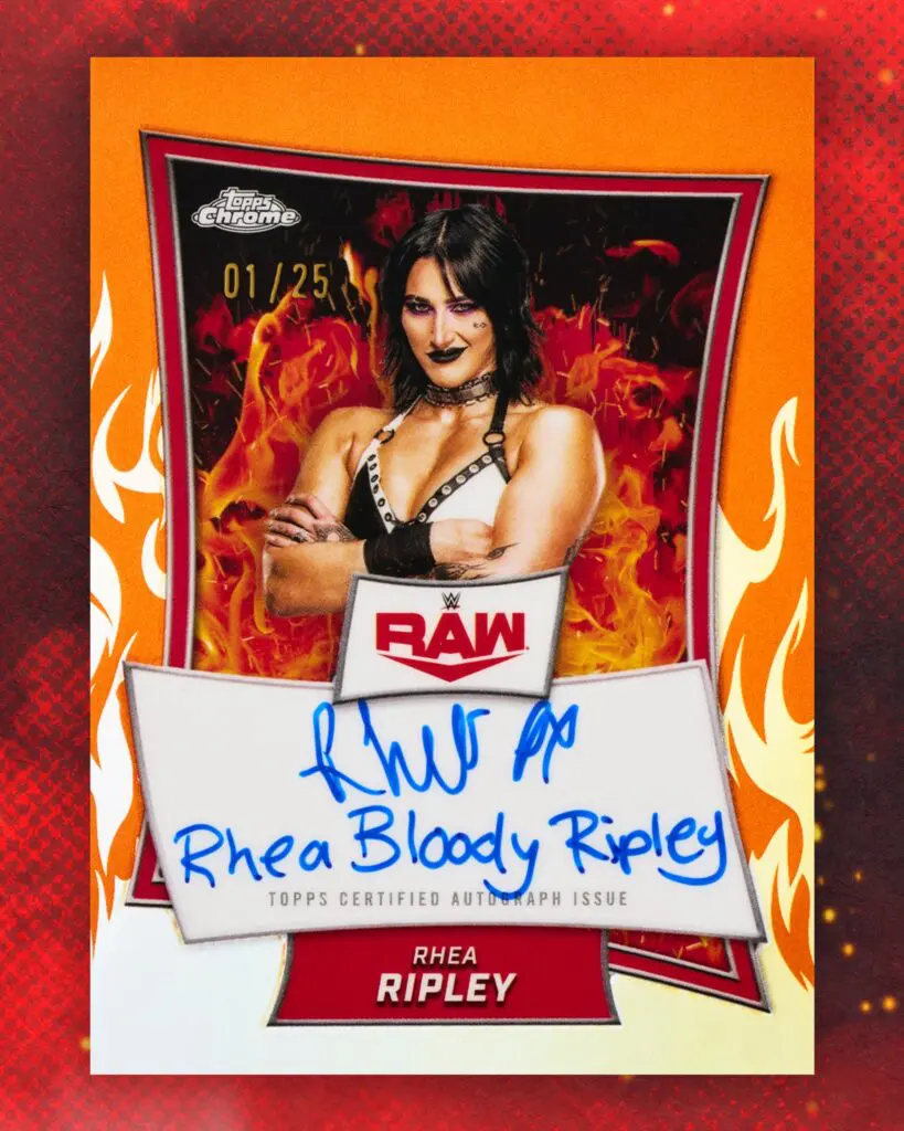 Today, they revealed a Rhea Ripley autographed card and there is only 25 made. The card is signed by Rhea herself and even has an inscription that reads “Rhea Bloody Ripley”. You can check it out below!