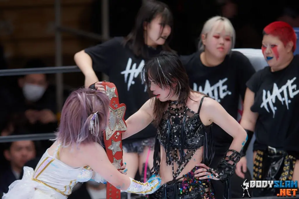 It began with a stare down from their respective corners. Basic chain wrestling quickly spilled to the floor, and chaos broke out. Tam hung from the post with a chain,, and then Saya sat on the top turnbuckle and reveled in H.A.T.E. destroying ringside. Tam got back in the ring and fought back with slaps and forearms. Saya attempted a top rope rana to the floor, but Tam blocked it and turned it into a submission before diving to the floor. Saya and Tam fought on the apron, and Saya hit an off-the-apron rana. At this point they were showing signs of the war and got back in at the 19 count. They began hitting each other with every special move in their arsenal and answered those with 1-count kickouts. Saya kicked out of the Violet Screwdriver; she fights back and hits a Star Crusher and then stares at Tam before blasting her Kamigoye variant to pin Tam. Masterful performance and show.
