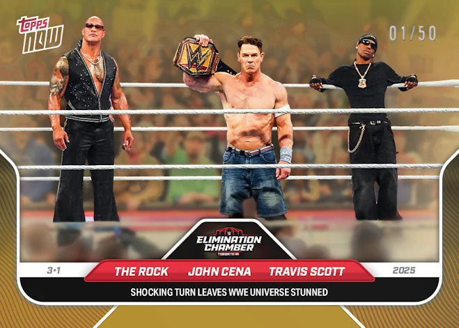 Topps Now has been releasing new trading cards for big WWE moments. Back at the Elimination Chamber, Topps Now dropped a few cards from the PLE, including one that featured The Rock, John Cena and Travis Scott. One lucky person who bought the card will receive at 1/1 card that is signed by all three men.