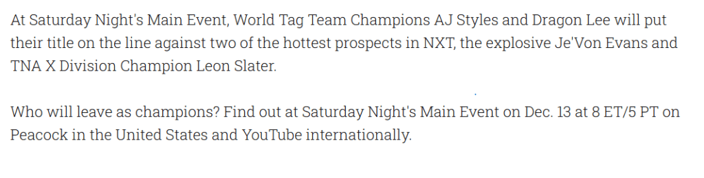 WWE Advertising AJ Styles and Dragon Lee vs Je’Von Evans and Leon Slater at Saturday Night’s Main Event as WWE World Tag Team Championship Match