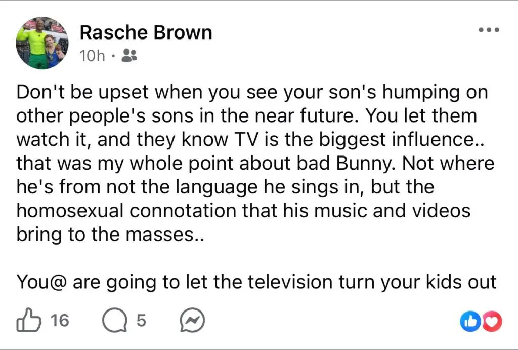 Rasche took to his Facebook page to speak about the Bad Bunny performances. While Bad Bunny himself didn’t do anything inherently “homosexual” there was a split second where the camera caught two men dancing on each other. And that was enough to send Mr. Brown into a spiral. He noted that we shouldn’t be upset when our sons are “humping on other people’s sons in the near future.” And said that people are going to let the television turn their kids out.