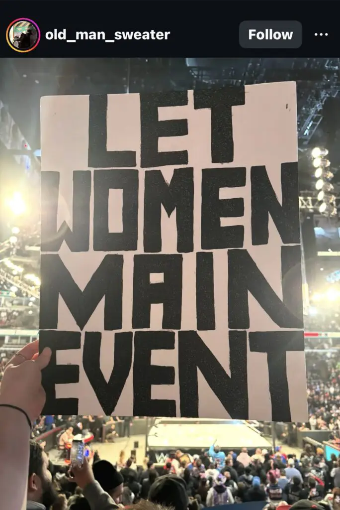 This past weekend at WWE Elimination Chamber, a fan with the Instagram handle “old_man_sweater” went to the event and took a sign that said “Let Women Main Event.” Simple enough, and seemingly harmful. But, they went on to say that WWE had confiscated the sign and took it away, so it wasn’t on camera. In the photo, you can see the fan was decently close to the ring.